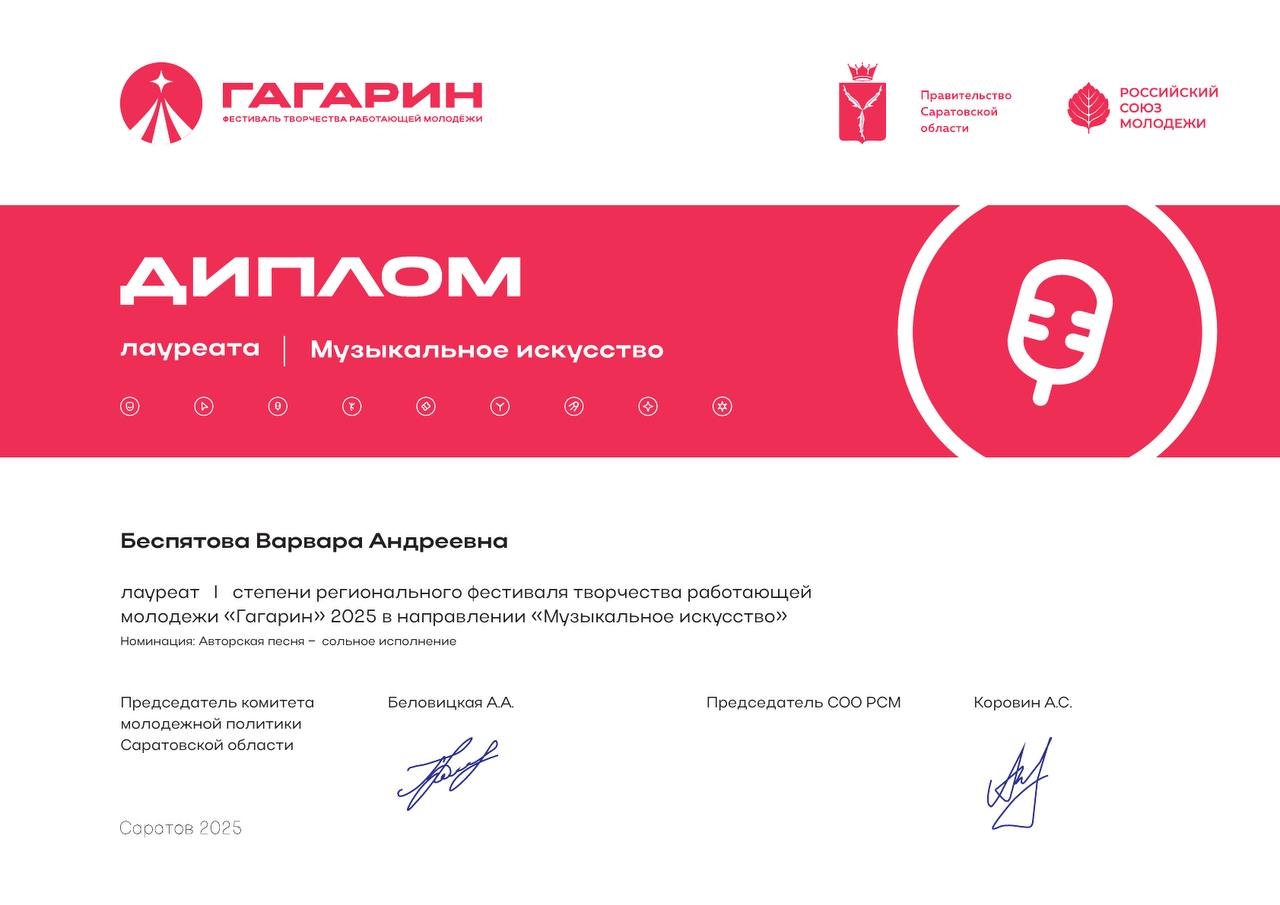 Новая смена культработников тоже показала себя великолепно! Молодой специалист Районного дома культуры Варвара Беспятова завоевала титул лауреата I степени на первом региональном фестивале творчества работающей молодежи «Гагарин». На очном отборочном этапе, проходившем в Александров-Гае в середине декабря, девушка исполнила яркую авторскую песню в духе современного русского фольклора.