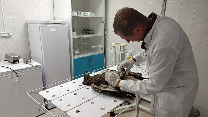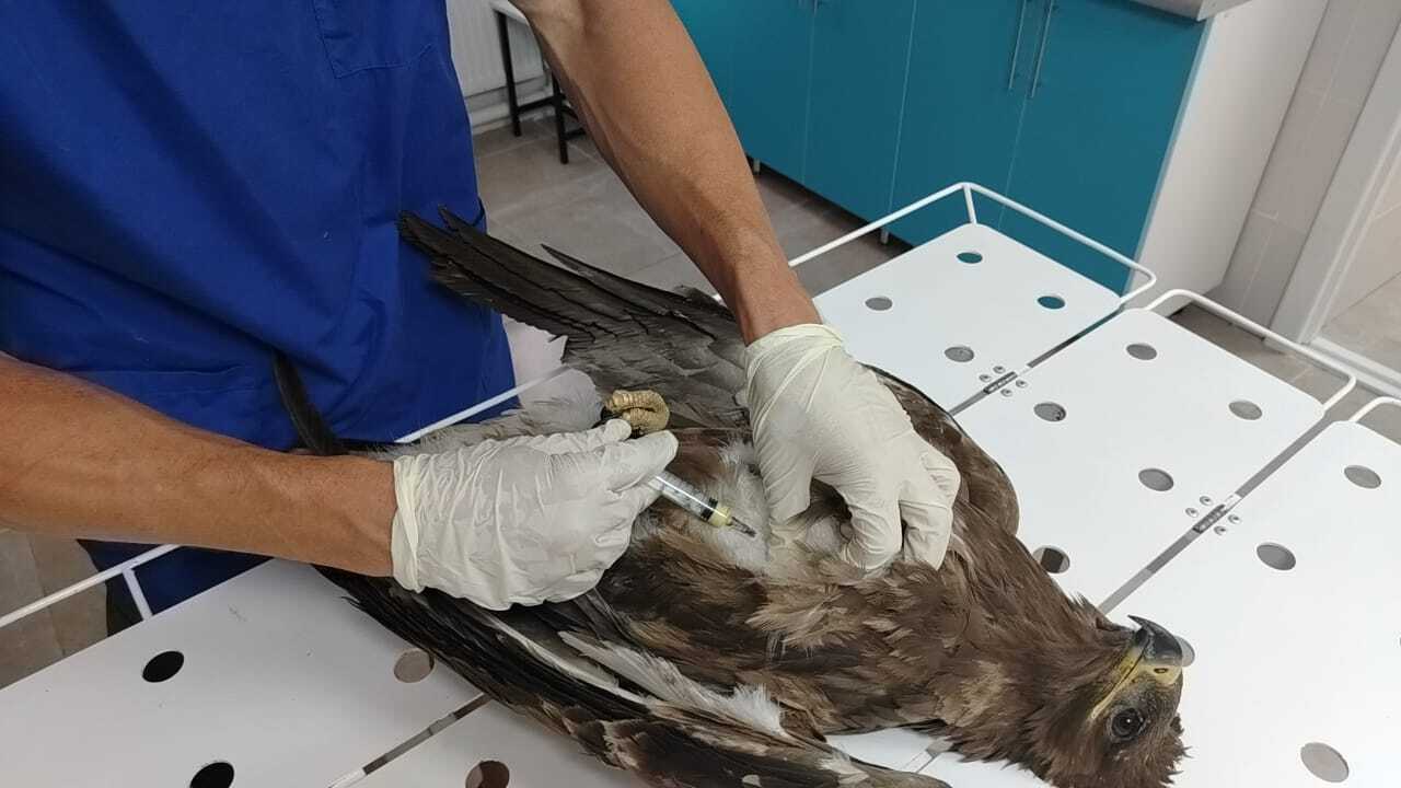 Убедившись, что орлёнок обезвожен, Сергей сделал ему инъекцию под кожу, восстанавливающую баланс жидкости организма.