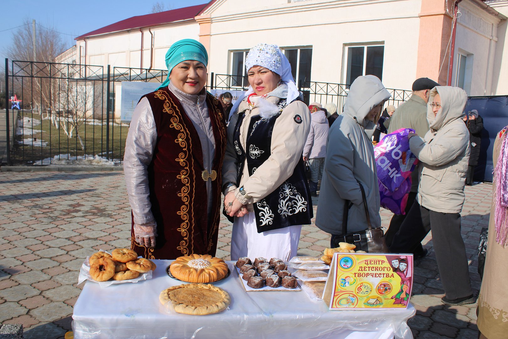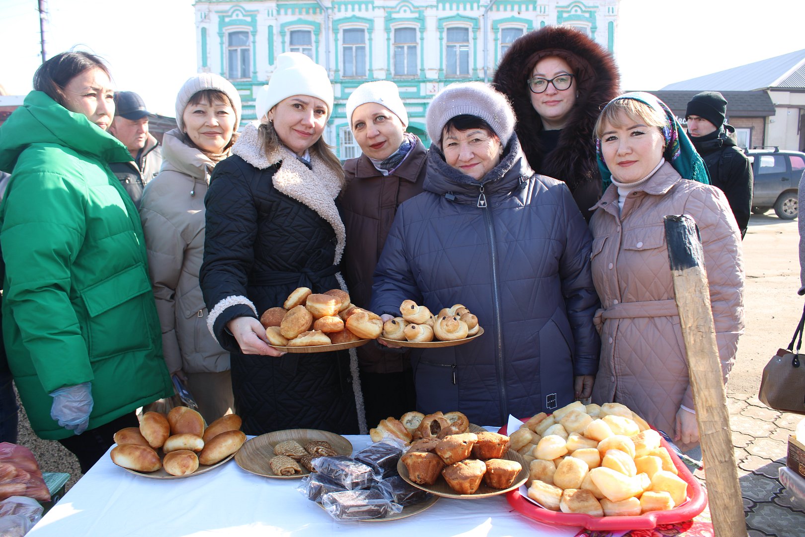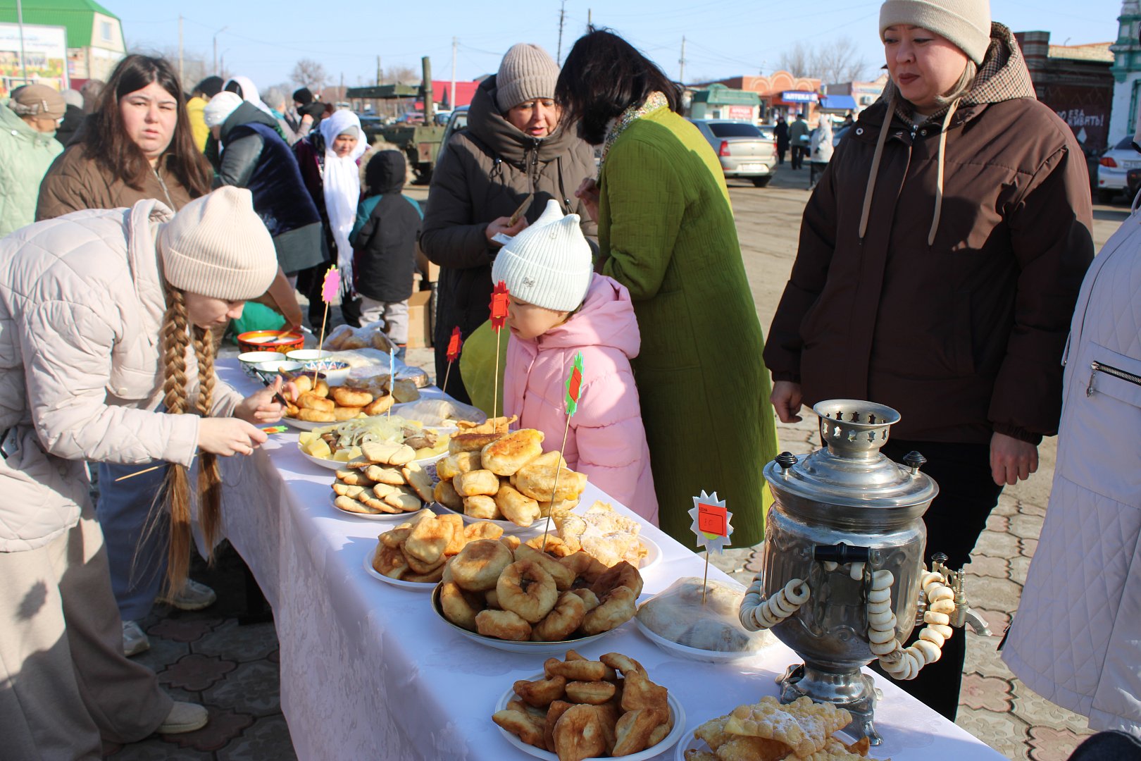 Утро воскресного дня встретило жителей райцентра холодным ветром, но свет яркого, пусть пока ещё не прогревающего солнца и праздничное настроение согревали собравшихся. Аромат ярмарки, в который вплелись запахи свежей выпечки и дымок полевой кухни, где готовился чай, зазывал новых гостей издалека. Участники ярмарки и артисты в ярких национальных костюмах создавали колоритную картину праздника. На столах, подготовленных хозяйками из учреждений и организаций района, были представлены разнообразные угощения: здесь соседствовали золотистые печёные жаворонки и воздушные баурсаки, хрустящий хворост и медовый чак-чак, русские пироги и казахский бешбармак. Так дружно, в духе многонационального единства, жители района — русские и казахи, татары и чеченцы — поддержали наших защитников, выручив на ярмарке 94 тысячи рублей!