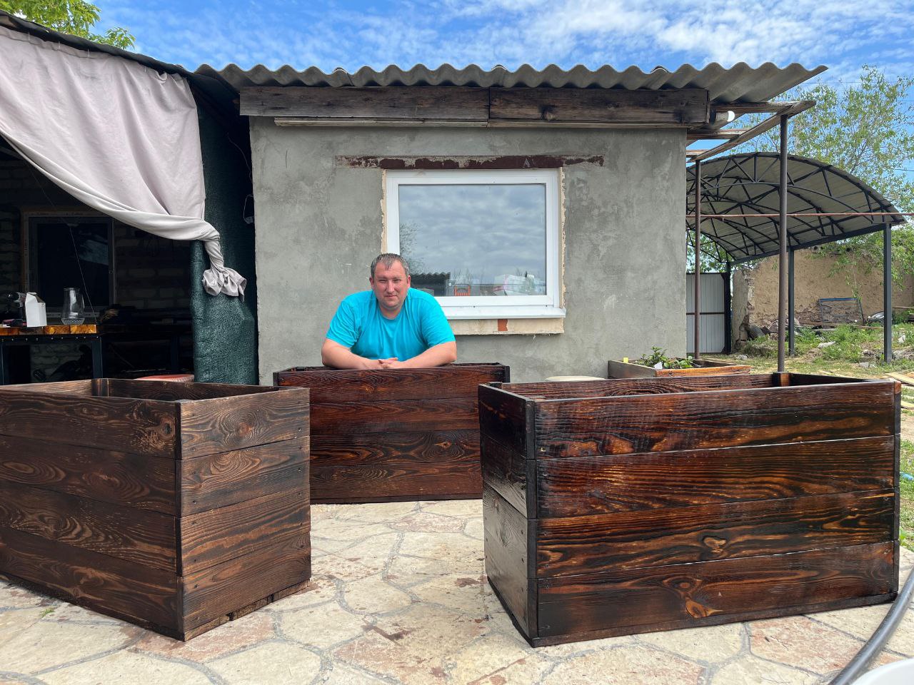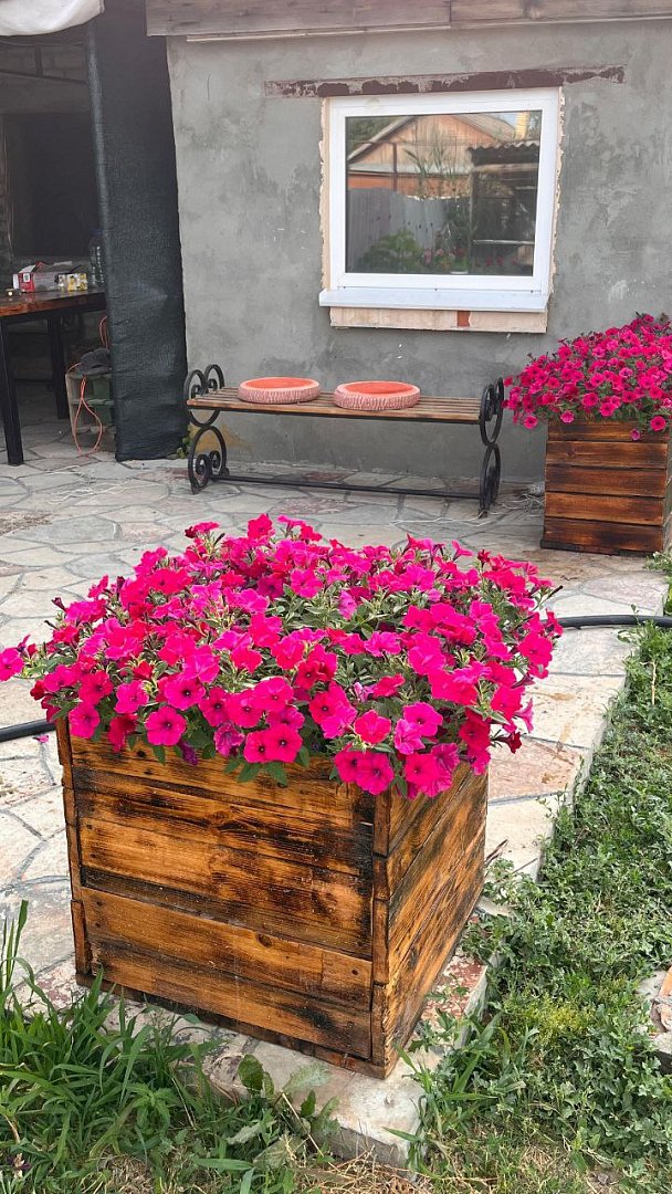На наш взгляд, деревянные кашпо, сделанные руками Александры и её супруга Владимира, выглядят представительнее! Обожжённое дерево, покрытое лаком, смотрится стильно: цветочные ящики прекрасно дополняют оформление двора, где каждая деталь, включая плитку, создана стараниями хозяев дома.