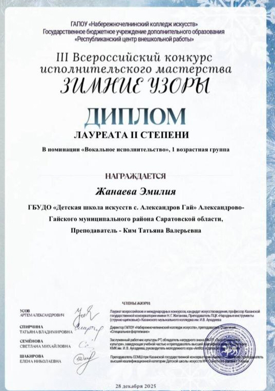 Подведены итоги III Всероссийского конкурса исполнительского мастерства «Зимние узоры», участие в котором приняли воспитанники Детской школы искусств и показали достойный результат.Дипломом лауреата II степени в номинации «Вокальное исполнительство» жюри отметило воспитанницу детского отделения вокального исполнительства Эмилию Жанаеву.