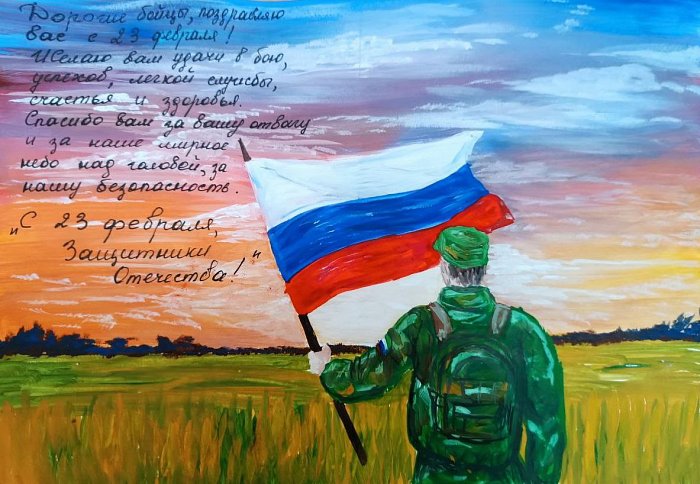 Спасибо вам за вашу отвагу и за наше мирное небо над головой, за нашу безопасность. С 23 февраля, Защитники Отечества!» - оставила пожелание на своём рисунке школьница.