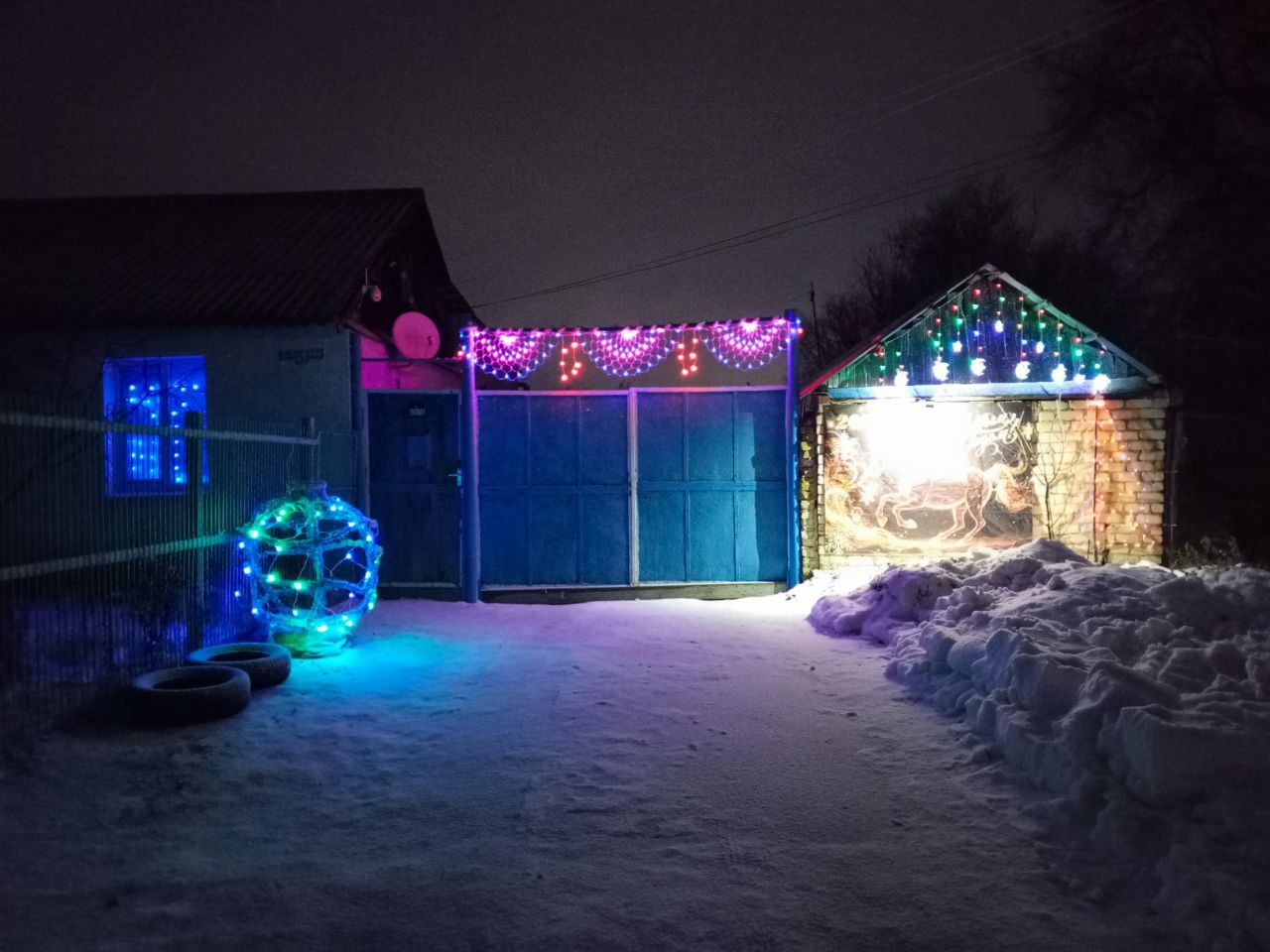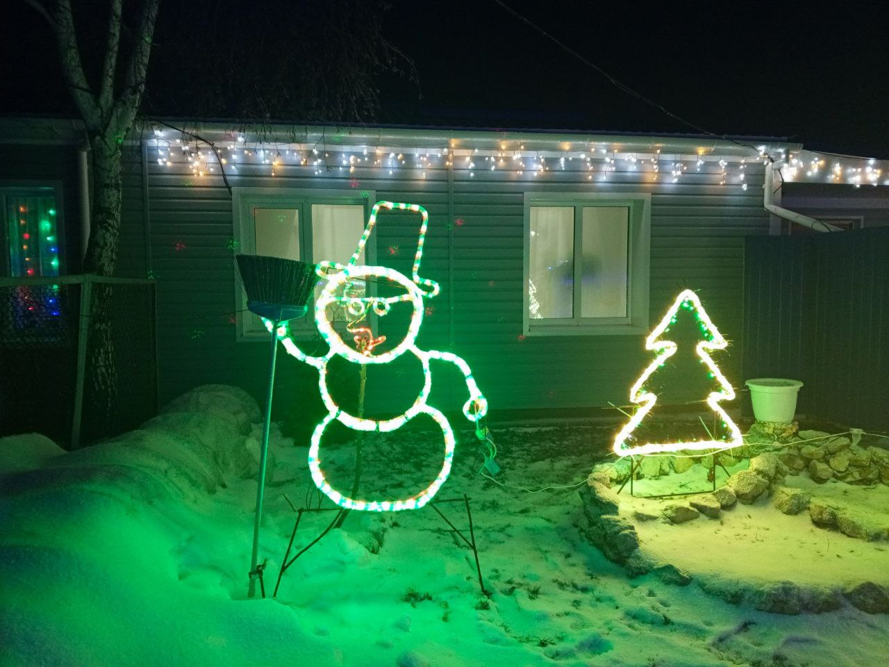 Улица Садовая упирается в улицу Первомайскую, где волшебство продолжается.Дом, забор, ворота и даже земля переливаются разноцветными огнями. У ворот великолепная светящаяся ёлка с огромной звездой. В палисадник так и хочется заглянуть, ведь там – забавный неоновый снеговик с метлой, в очках и шляпе и ёлочка.