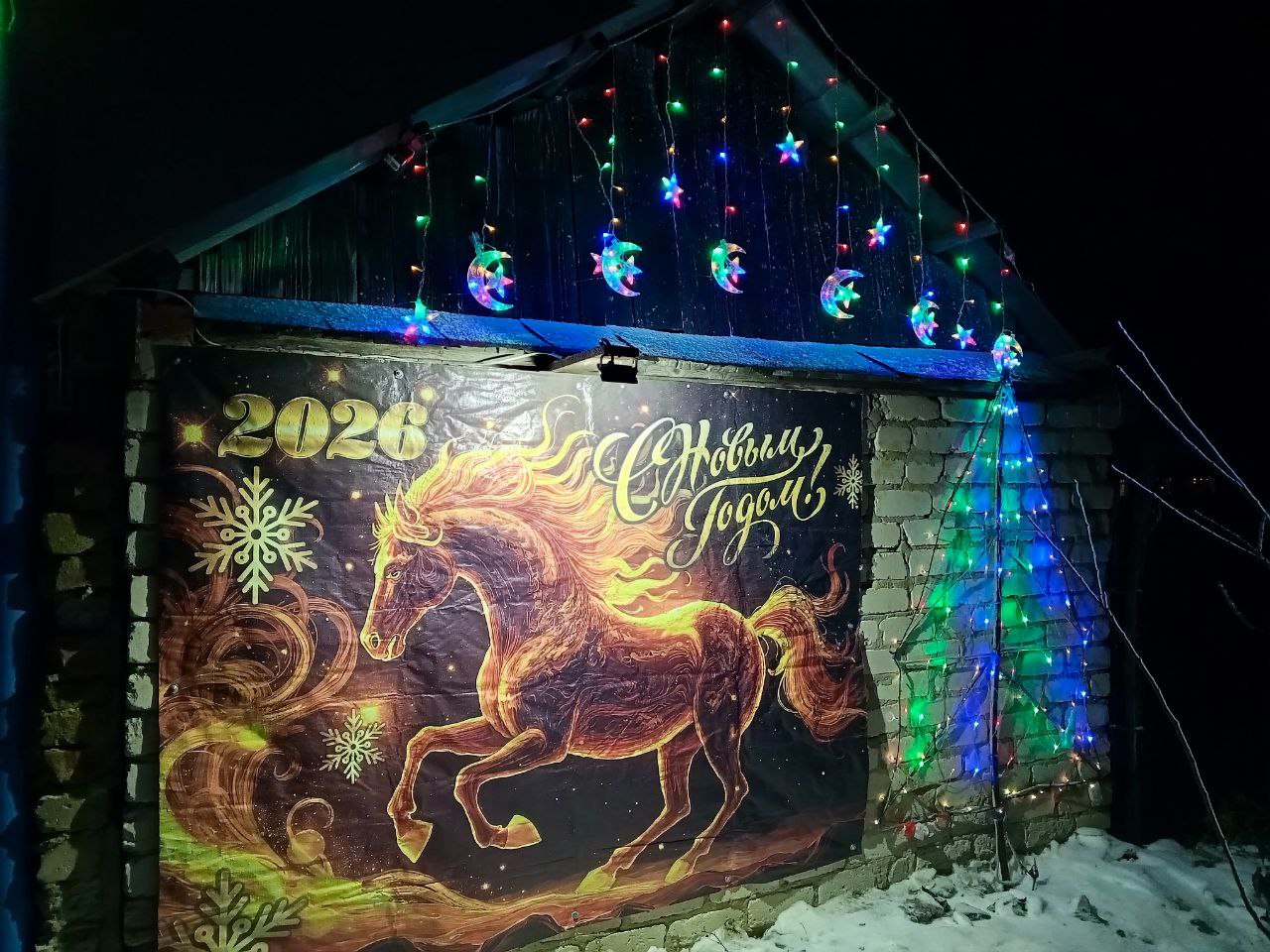 Не забывают о традициях и жители улицы Садовой. Каждый год семья Зобниных украшает свой дом, создавая новогоднее настроение прохожим и соседям. В этом году под освещением необычных (таких не встретишь нигде) гирлянд на стене красуется великолепный символ года – Красная огненная Лошадь.
