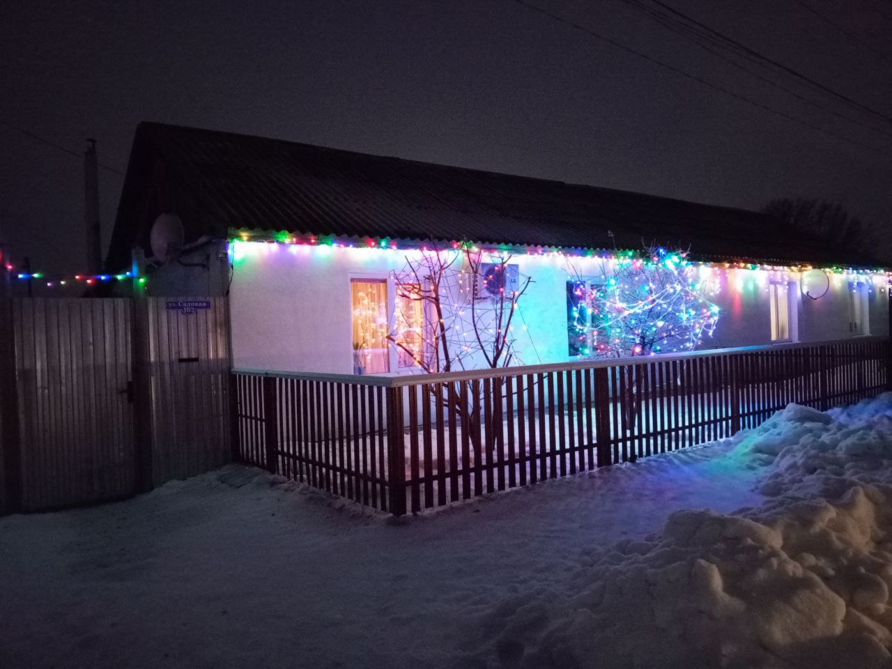 Напротив стоит дом семьи Старухиных. Его убранство напоминает сюжет из сказки про Серебряное Копытце – деревья и стены словно усыпаны драгоценными камнями. Несмотря на преклонный возраст Александр Иванович и Валентина Викторовна каждый год в это время наряжают дом для того, чтобы порадовать своих внучат, соседских ребятишек и просто случайных прохожих.