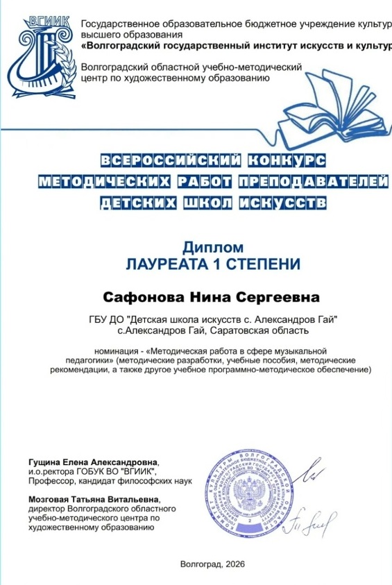 Преподаватель Детской школы искусств села Александров Гай Нина Сергеевна Сафонова одержала победу во Всероссийском конкурсе методических работ преподавателей детских школ искусств.Конкурс был организован Волгоградским государственным институтом искусств и культуры и собрал педагогов со всей страны.