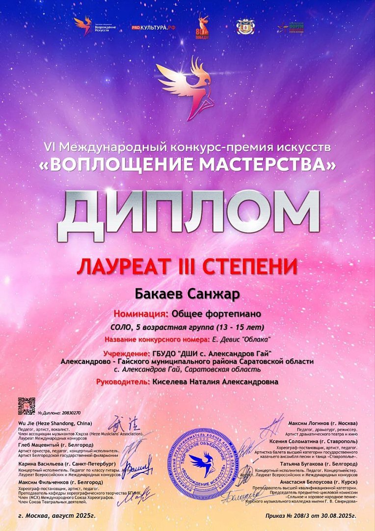 Поздравляем учащегося Детской школы искусств села Александров Гай Санжара Бакаева с присуждением диплома Лауреата III степени на VI Международном конкурсе-премии "Воплощение мастерства" в номинации "Общее фортепиано"!Стоит особо подчеркнуть, что Санжар неоднократно побеждал в престижных конкурсах именно как исполнитель на саксофоне — это его основная специализация. Однако игра на фортепиано стала новым направлением, которым мальчик начал заниматься всего около года назад. Несмотря на столь короткий срок занятий, юное дарование уже смогло завоевать титул Лауреата II степени на областном творческом состязании, а теперь успешно выступило на международном уровне.