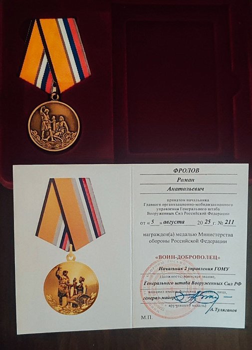 Студент Института юстиции СГЮА, участник специальной военной операции Роман Фролов награжден ведомственной медалью Министерства обороны Российской Федерации «Воин-доброволец».Медаль вручается бойцам СВО за мужество, стойкость и высокий профессионализм, проявленные в ходе боевых действий.