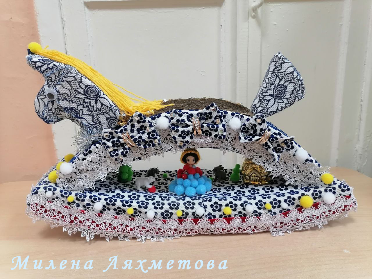 -Семью Милены Аяхметовой (детский сад «Малыш»). Судейскую коллегию впечатлили идея работы и внимание к деталям: сказочный мир, небосводом для которого стала лошадка, украшенная кружевом. Здесь живут девочка со своими друзьями-животными;