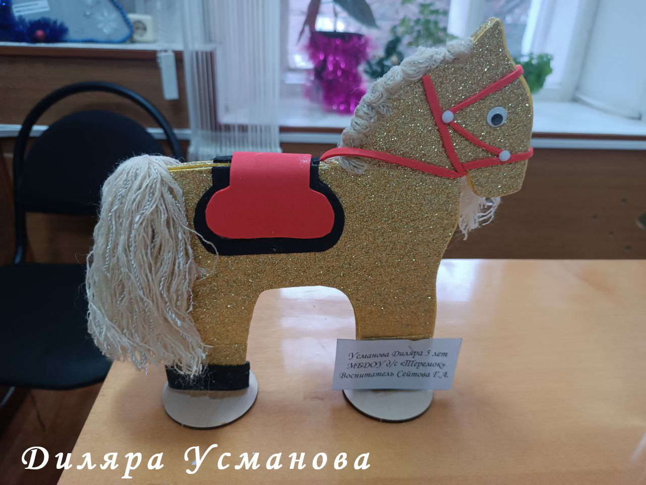 - Семью Диляры Усмановой (детский сад «Теремок»). Милая, но при этом элегантная, «золотая» лошадка с шикарной гривой стала фавориткой для редактора газеты Гульсары Сулеменовой;