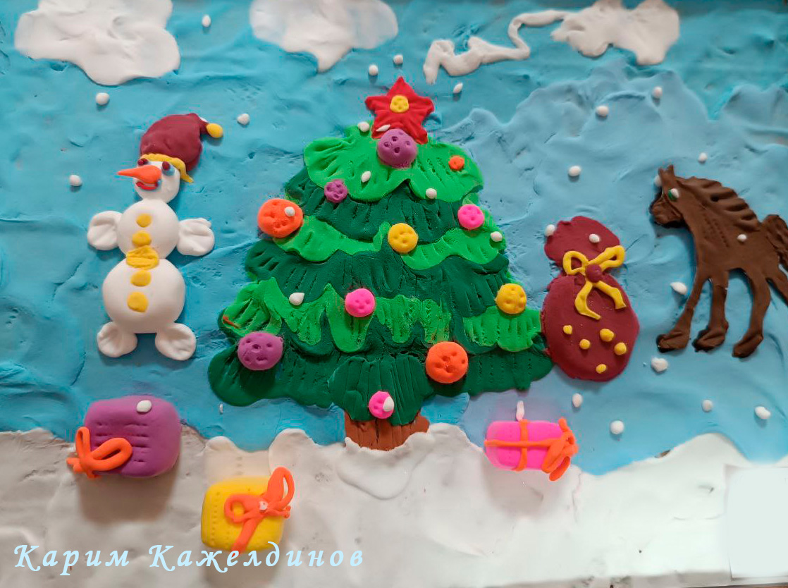 - Карима Кажелдинова (школа №2). Его картина из воздушного пластилина, на которой лошадка ожидает прихода зимнего праздника под елочкой, невольно отправила нас в детство, напомнив мультфильм «Пластилиновая ворона»;
