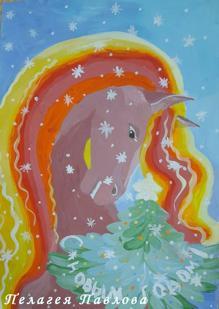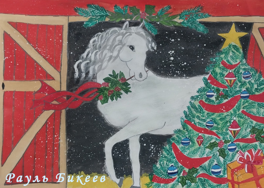 - Семью Рауля Бикеева (детский сад «Малыш»). Рисунок белой лошади, заглянувшей на праздник, наполнен новогодним настроением;