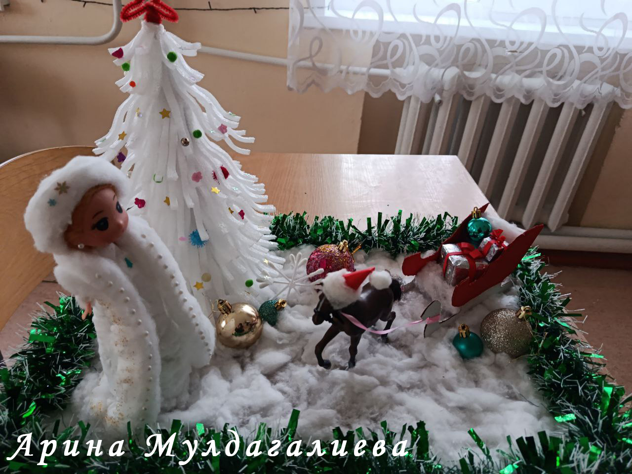 - Арину Мулдагалиеву (школа с. Новоалександровка). Новогодняя композиция главными героями которой стали Снегурочка и лошадка, везущая на праздник сани с подарками, выглядит очень ярко и празднично, создавая атмосферу новогоднего волшебства;