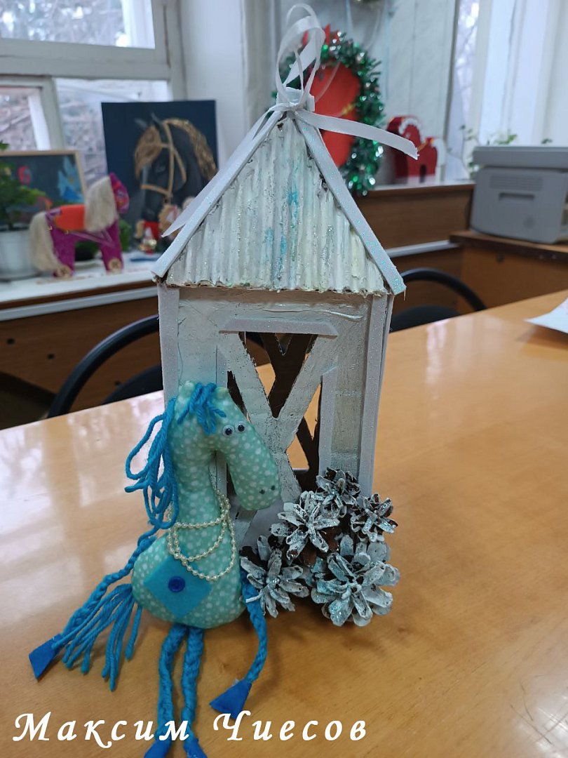 - Максима Чиесова (школа №1). Сказочный фонарь с мягкой игрушкой – нежно-голубой лошадью (изящной работой так и хочется украсить ёлку) пришелся по душе корреспонденту Ларисе Ким.