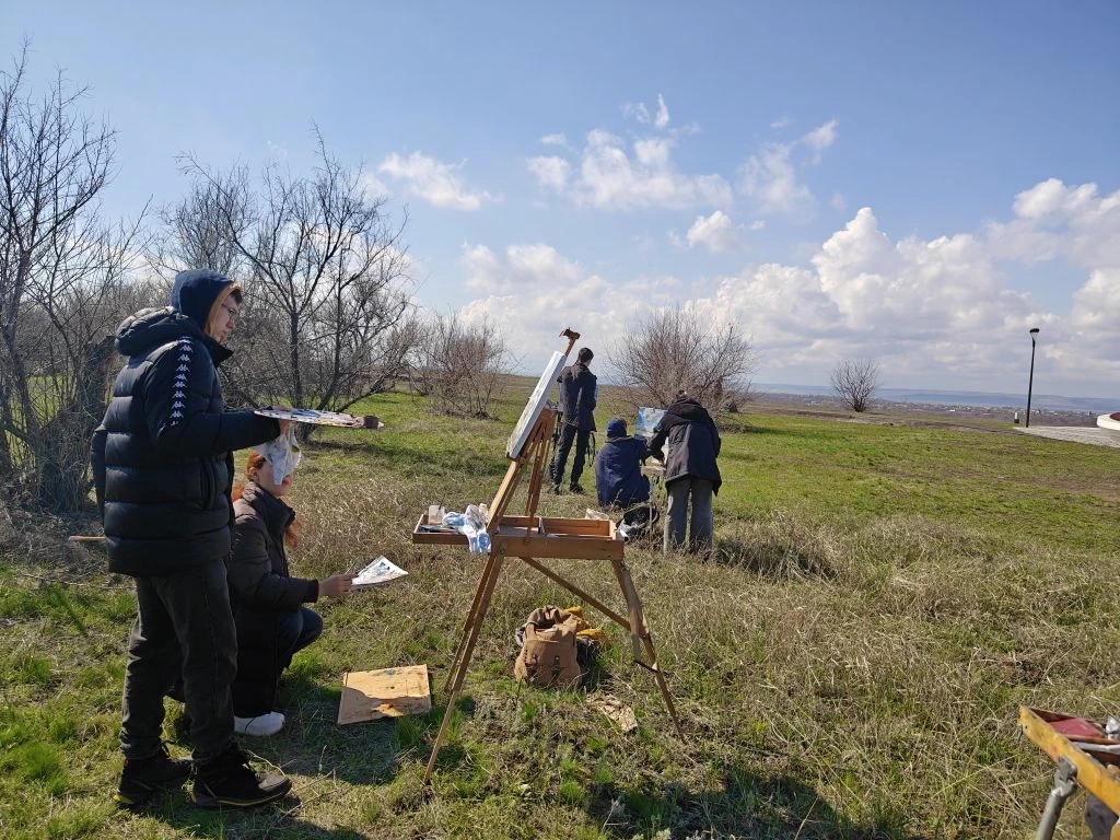 Будущие художники под руководством наставников выбирают натуру и приступили к эскизам пейзажей парка, его арт‑объектов и бескрайней степи — той самой, где 65 лет назад приземлился первый космонавт.