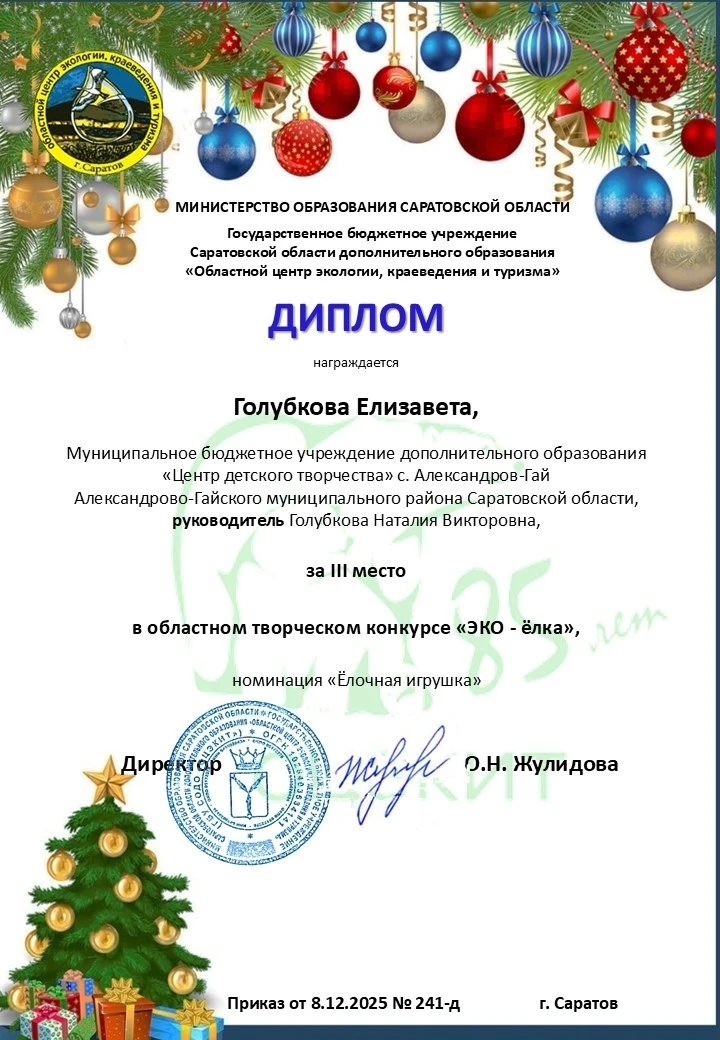 Областной центр экологии, краеведения и туризма подвёл итоги увлекательного и яркого творческого соревнования школьников региона — конкурса «Эко - ёлка». Мероприятие прошло в рамках масштабного экологического проекта «Мы в ответе за планету».Конкурс собрал сотни оригинальных и креативных работ юных участников со всей области. Ребята проявили свою фантазию и талант, представив вниманию жюри разнообразные украшения для новогодней ёлки — праздничные шары, фигуры снеговиков, уникальные светящиеся фонари, игрушки ручной работы и даже объёмные композиции сказочных персонажей.