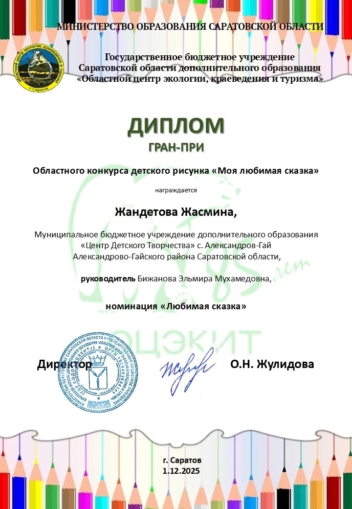 Подведены итоги регионального конкурса детского рисунка «Моя любимая сказка», организатором которого выступил Областной центр экологии, краеведения и туризма.Участники творческого состязания — дети от 5 до 17 лет из разных уголков Саратовской области — представили на суд жюри работы в номинациях «Любимая сказка», «Любимый мультфильм», «Любимое сказочное растение», «Любимая сказочная страна», выполненных в разных техниках рисования.