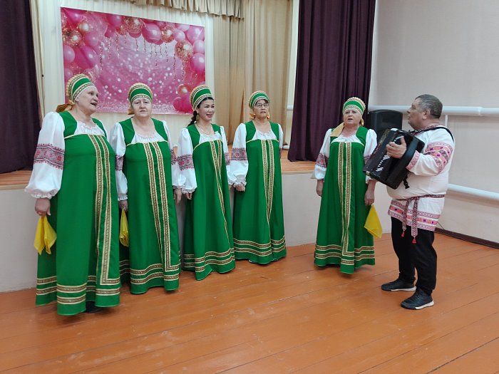 Когда я приехала на встречу, женщины распевались. Ничто так не трогает душу, как хорошая народная песня и звуки гармони, которые плавно разливались по всему пространству Дома культуры. Завидев меня, коллектив прервал репетицию, и стало даже как-то жаль, что не удалось дослушать мелодию до конца. Тут же, рядом со сценой, мы разместились в красивых удобных креслах обновлённого Дома культуры и завели разговор.