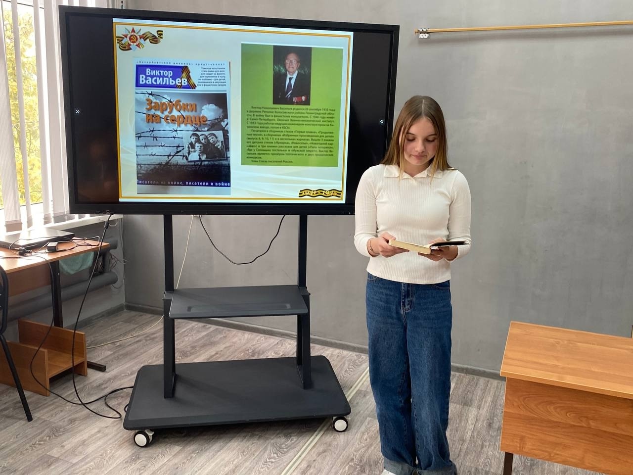Для учеников старших классов школы №1 были проведены громкие чтения произведений, повествующих о детях, живших в военное время. Среди представленных книг — роман Виталия Семина «Нагрудный знак «ОСТ», автобиографическая повесть Виктора Васильева «Зарубки на сердце», повести Василия Клёпова «Тайна Золотой долины» и «Четверо из России», а также произведение Ури Орлева «Остров на Птичьей улице».