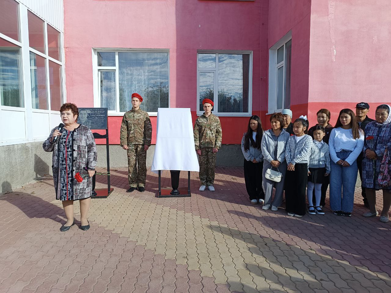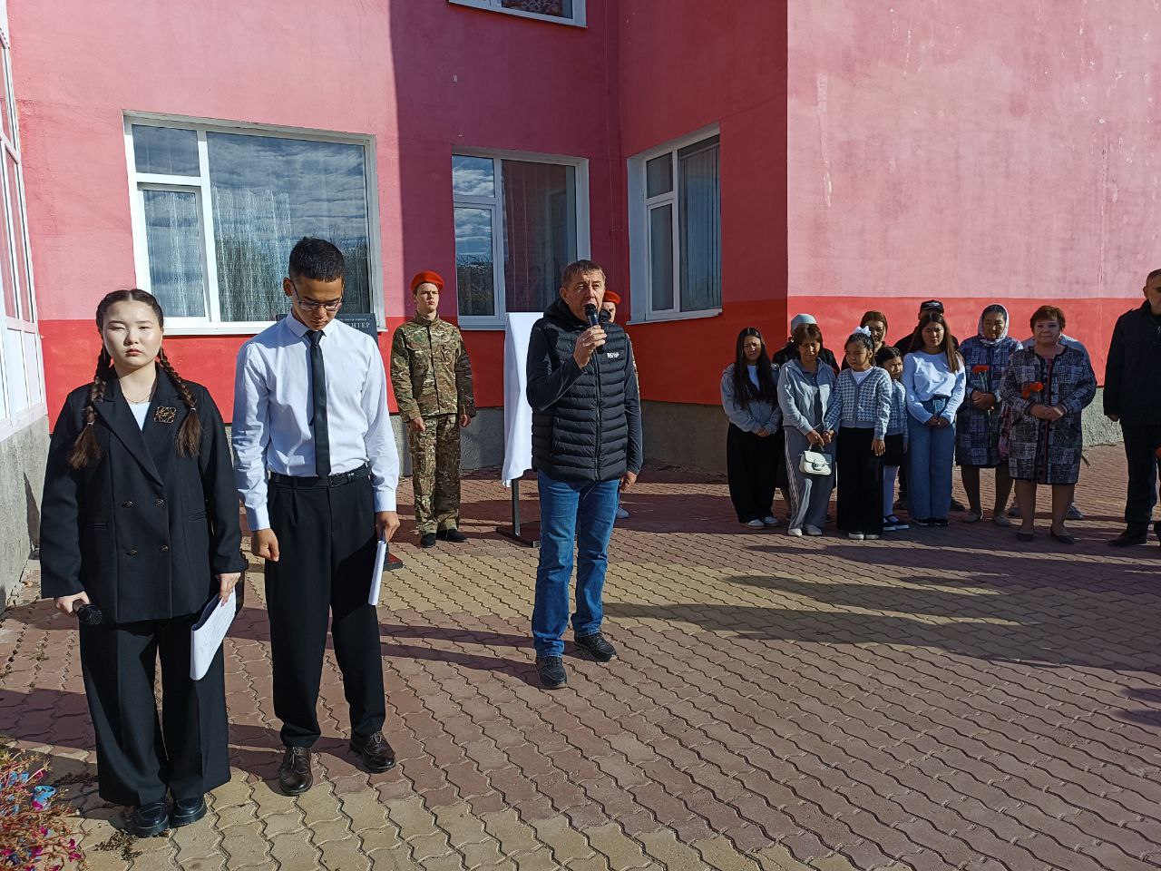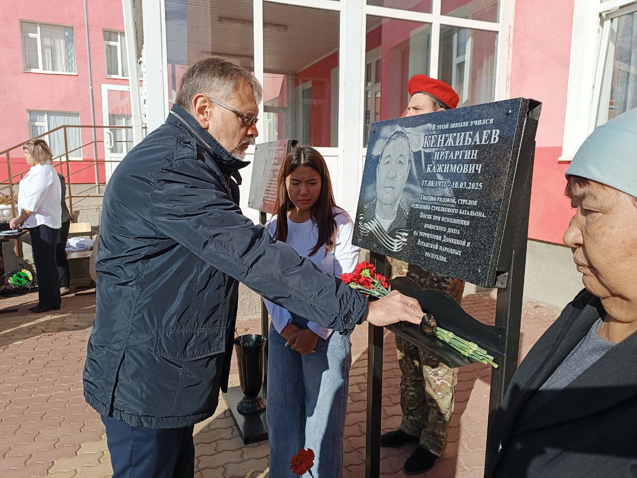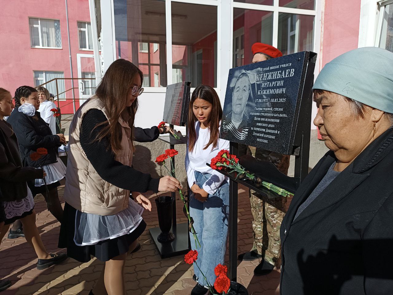 Да, здесь снова прошла церемония открытия мемориальной доски в память о выпускнике, на этот раз говорили об Иртаргине Кажимовиче Кенжибаеве, погибшем при выполнении воинского долга в зоне проведения специальной военной операции.
