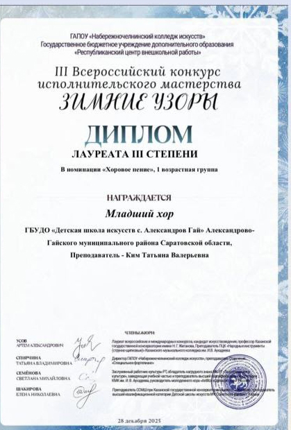 Диплом лауреата III степени в копилку творческих побед добавили участники младшего хора ДШИ. Преподаватель юных талантов — Т. В. Ким.