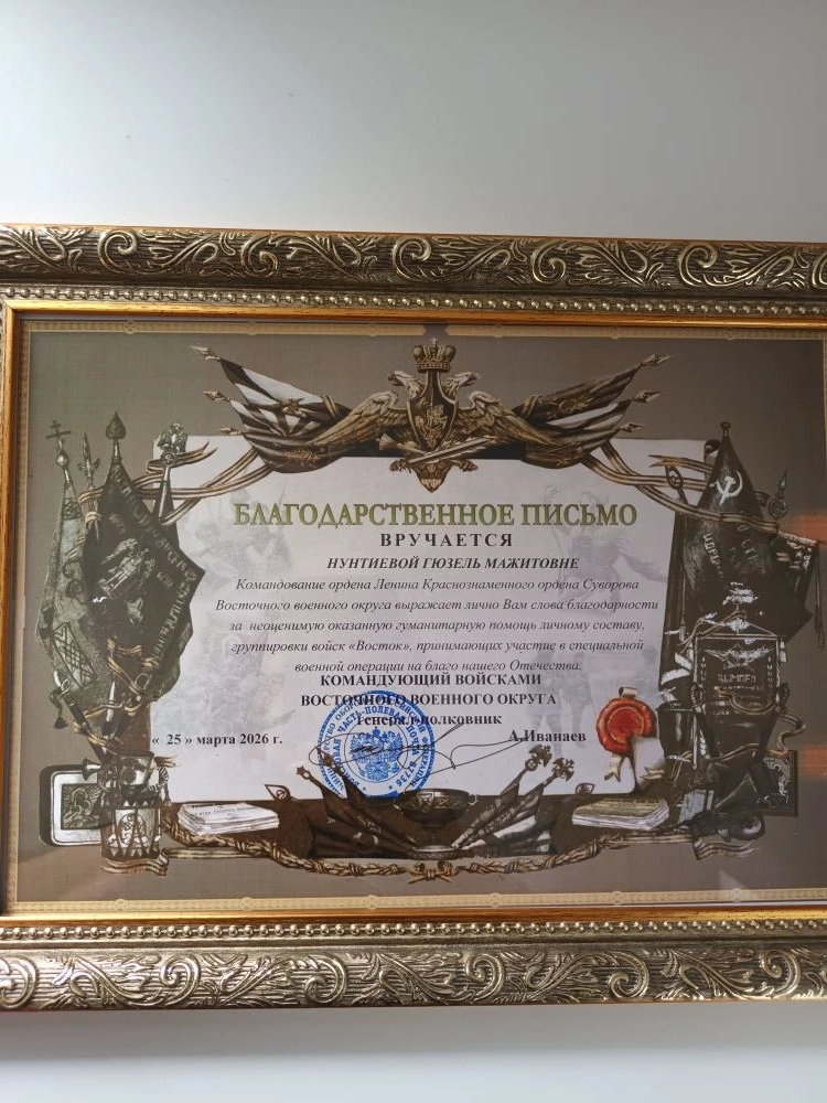 Недавно командование группировки войск «Восток» отметило заслуги жительницы нашего района Гузель Мажитовны Нунтиевой, лидера волонтёрского движения «Варфоломеевцы и Другие…». Ей вручили Благодарственное письмо и медаль «За содействие СВО» «…за неоценимую оказанную гуманитарную помощь личному составу группировки войск «Восток», принимающих участие в специальной военной операции на благо нашего Отечества".Напоминаем, что с момента основания группы, 4 февраля 2023 года, активисты собрали внушительную сумму — 7643466 рублей (без учета текущих сборов). Все собранные средства идут на реализацию заявок наших бойцов СВО.