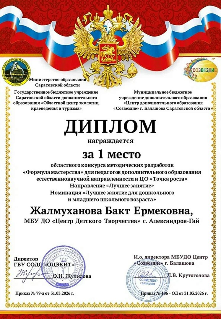 • Бакт Ермековна Жалмуханова — 1 место в номинации «Лучшее занятие для дошкольного и младшего школьного возраста».