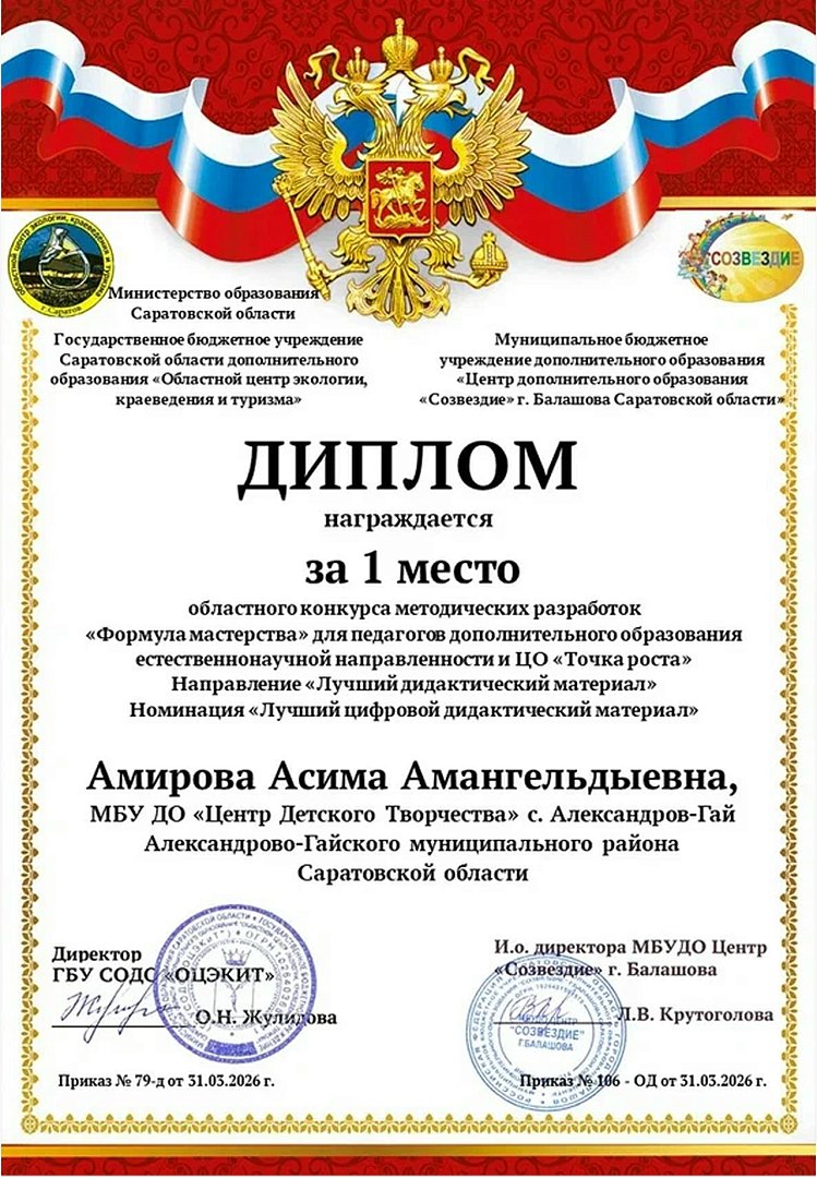• Асима Амангельдыевна Амирова — 1 место в номинации «Лучший цифровой дидактический материал».