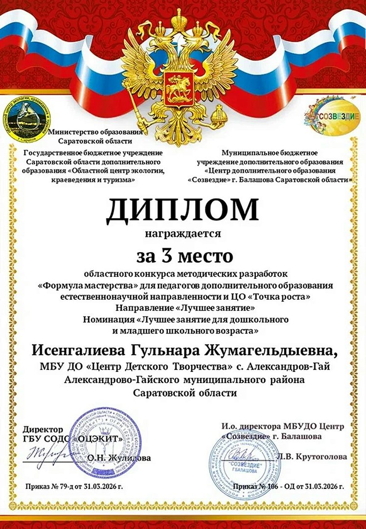 • Гульнара Жумагельдыевна Исенгалиева — 3 место в номинации «Лучшее занятие для дошкольного и младшего школьного возраста».