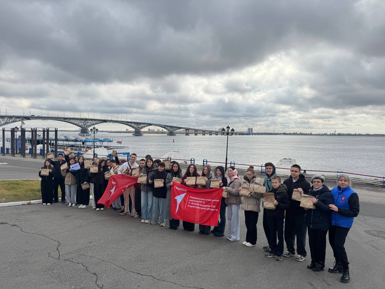 В этот день для старшеклассников, в поездке участвовало 32 ребёнка, и наставников, их роль выполнили координатор деятельности Движения Первых в Александрово-Гайском районе Наталья Котова и руководитель первички школы №3 Надежда Мозоль, провели автобусную обзорную экскурсию по памятным местам Саратова, связанным с событиями Великой Отечественной войны. Отдельным пунктом поездки стала обновлённая Набережная Космонавтов, где ребята полюбовались стильными арт-объектами и граффити.