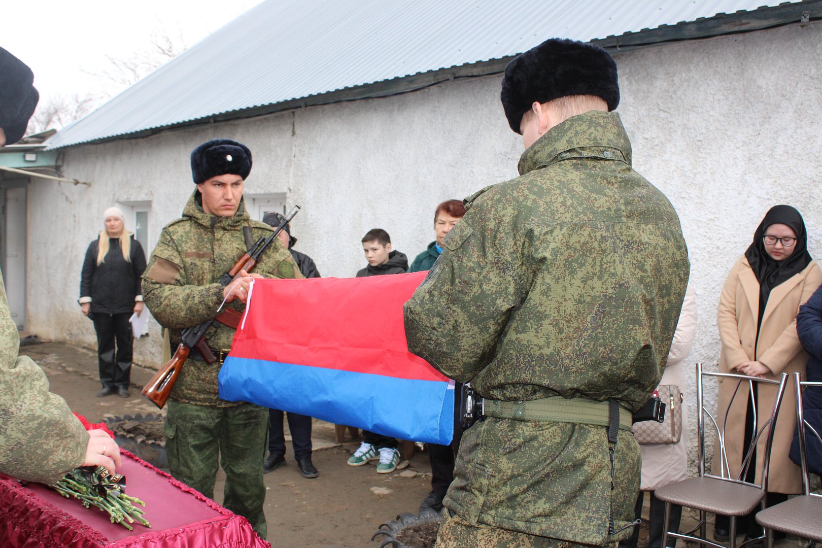 Память героя собравшиеся почтили минутой молчания. Флаг Российской Федерации почётный караул передал вдове бойца Алмагуль Ибатулиной.
