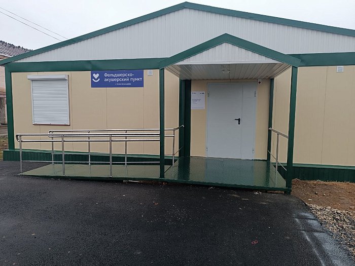 Новый ФАП уже установлен. К зданию подключены необходимые инженерные системы: электроснабжение, водоснабжение и канализация. Завершены отделочные работы. Полезная площадь внутри — 82-85 кв. м.