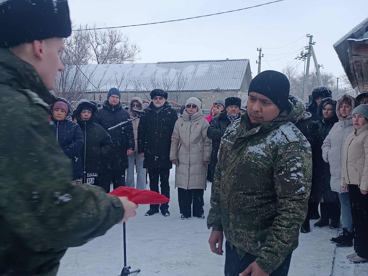 Память погибшего почтили минутой молчания, а флаг Российской Федерации, как символ воинской доблести во имя Родины, передали младшему брату Жаната.